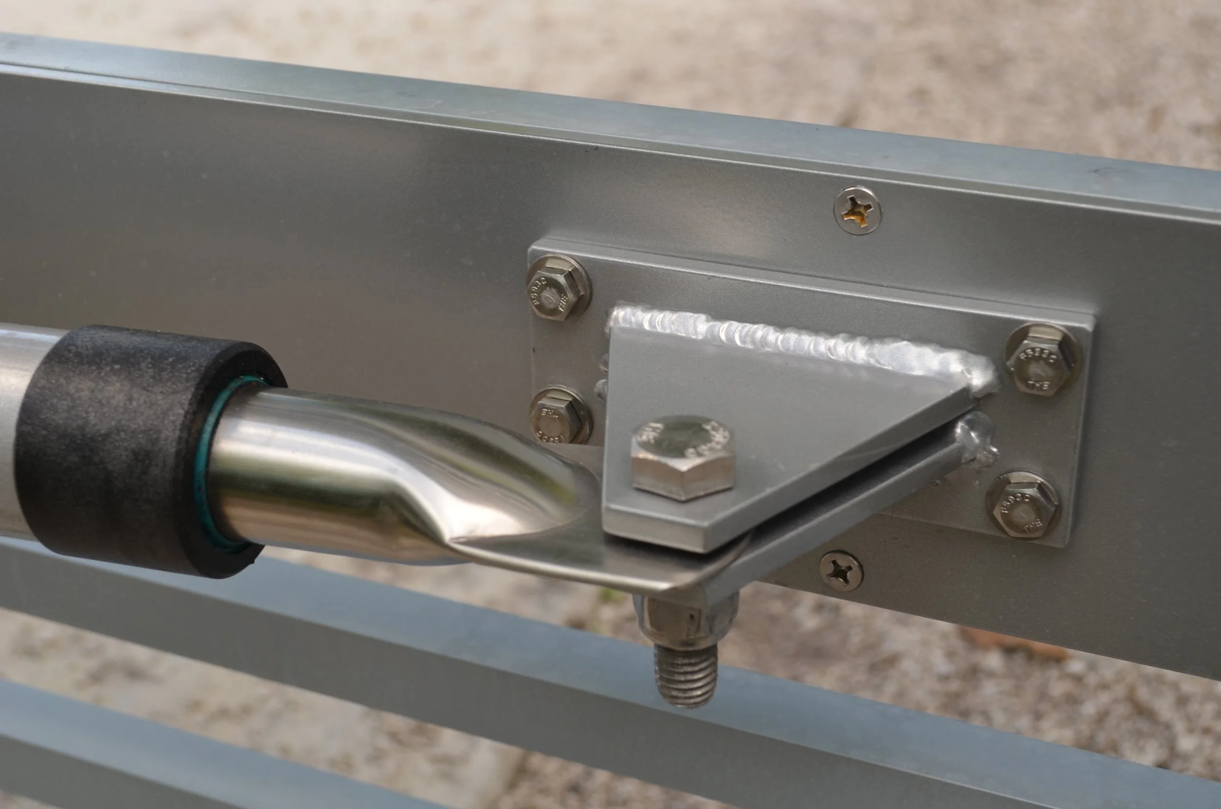 With LA 400’s we never use the factory rear mounts and on occasion fabricate custom front mounts. On this installation we added silver powder coated plates to mount the front bracket and to also distribute the load on the gate better. Ended up hiding the actuators as well.
